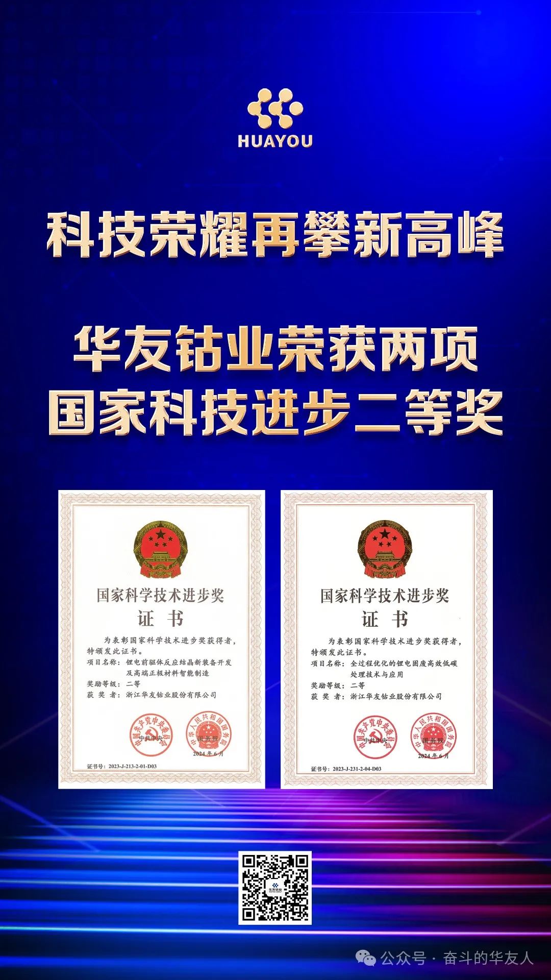 On June 24th, the 2023 National Science and Technology Awards were announced, and two scientific research achievements led by the Institute of Process Engineering of the Chinese Academy of Sciences and participated by Huayou - "Development of new equipment for lithium precursor reaction crystallization and intelligent manufacturing of high-end cathode materials", "Efficient and low-carbon treatment technology and application of lithium solid waste with whole-process optimization" won the second prize of National Science and Technology Progress in 2023, marking that Huayou's innovations in the fields of green refining of non-ferrous metals, lithium materials development, and resource recycling and regeneration utilization climbed to a new peak again, and highlighting Huayou's leading position in the technological innovation and sustainable development of new energy materials. It demonstrates Huayou's leading position in technological innovation and sustainable development of new energy materials.