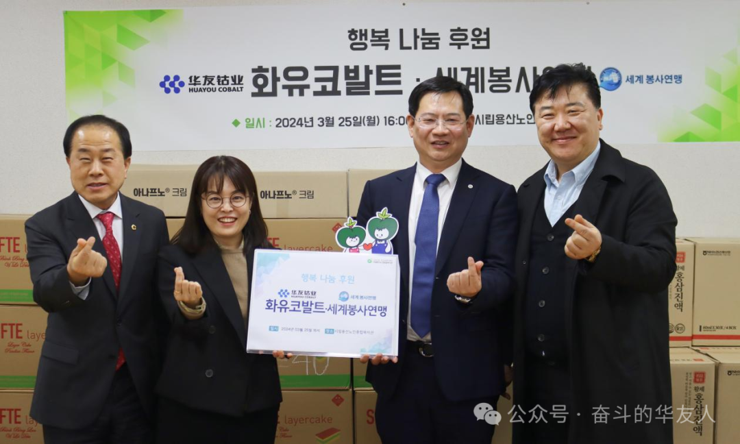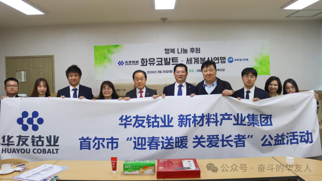 3月25日,華友鈷業新材料產業集團韓國代表處攜手首爾市議會金榮鎬議員、世界公益聯盟洪禎雨會長一同前往韓國首爾市立龍山老人綜合福祉館,共同開展“迎春送暖,關愛長者”公益活動,為長者們送去溫暖和關懷。