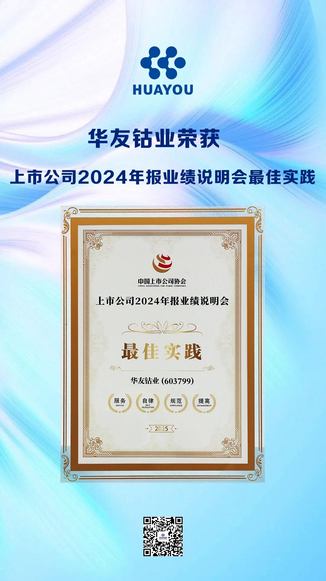 中國上市公司協會發布“2024年報業績說明會最佳實踐”榜單,公司精心組織、創新呈現的2024年度業績說明會,再次榮獲“最佳實踐”案例。此次說明會通過網絡直播向境內外投資者開放,不僅以詳實的數據深度解讀了公司的戰略布局、經營成果與行業洞察,更通過互動性極強的溝通形式,精準、主動地回應了市場關切,展現了管理層對公司未來的堅定信心與清晰規劃。該榮譽標志著公司在投資者關系管理、信息透明化及價值傳遞方面已達到行業領先水平,贏得了監管機構與市場投資者的雙重認可。