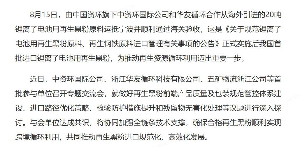8月15日,由中國資環(huán)旗下中資環(huán)國際公司和華友循環(huán)合作從海外引進的20噸鋰離子電池用再生黑粉原料運抵寧波并順利通過海關(guān)驗收,這是《關(guān)于規(guī)范鋰離子電池用再生黑粉原料、再生鋼鐵原料進口管理有關(guān)事項的公告》正式實施后我國首批進口鋰離子電池用再生黑粉,為推動再生資源循環(huán)利用邁出重要一步。